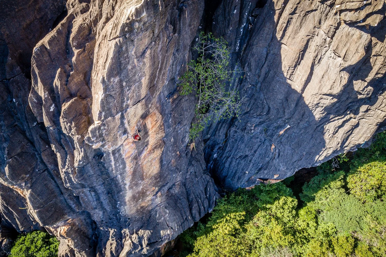Climber: Alessandra Giordano, Route: Sombras Flutuantes 7c+, Sector: Sombras / G3. This drone image shows the beautiful line of Sombras Flutuantes and many other great line of the Sombras Sector. Photographer: Alexandre Ferreira.